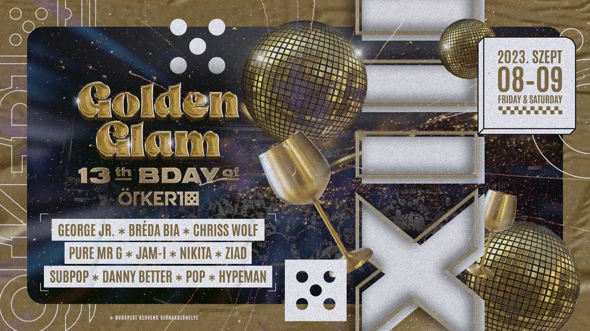 Már 13 éve bulizunk veletek! Készüljetek, mert Szeptember 8-9 közt egy felejthetetlen Golden Glam hétvégével ünnepeljük születésnapunkat! Lépjetek be egy igazán impozáns világba, ahol most sem spórolunk az energiánkkal – ismét a város legexkluzívabb partijával pörgetjük fel az elmúlt évek emlékeit!
